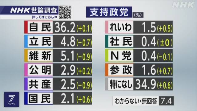 「れいわ新選組」が1.5%、「社民党」が0.4%、「NHK党」が0.4%、「参政党」が1.6%、「特に支持している政党はない」が34.9%でした。