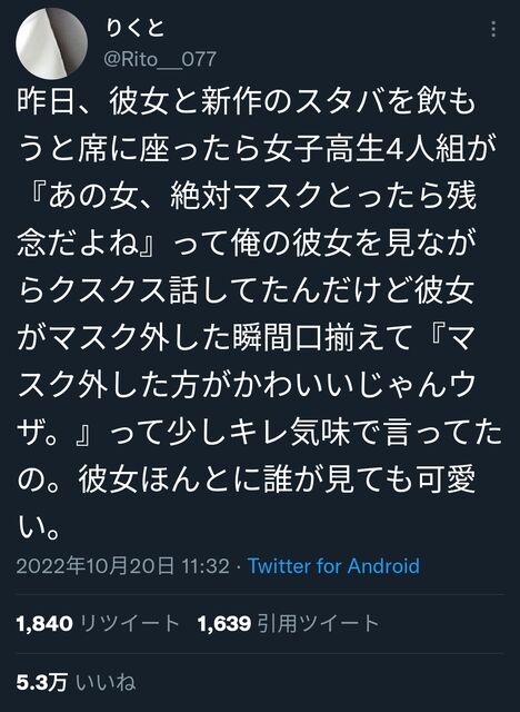スタバ女子高生「あの女マスク取ったら絶対残念だよね」彼女「スッ(マスクを外す)」→結果 2022/10/24 芸能人の気になる噂 1: 風吹けば名無し 2022/10/23(日) 16:05:43.71 ID:6YHmJfqZ0 https://livedoor.blogimg.jp/uwasainfo/imgs/b/c/bc0981a3.jpg 続きを読む Source: 芸能人の気になる噂