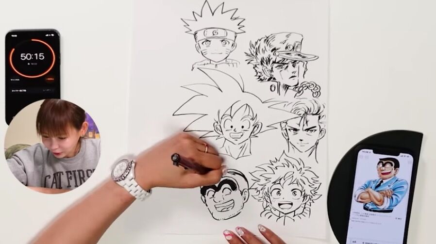そしていよいよ、お絵描きスタート。下書きする余裕もないため、一発で筆入れ。1人目は『ドラゴンボール』の孫悟空。スマホの画面を見ながらスラスラと描くと、その横に『ジョジョの奇妙な冒険』の空条承太郎、『NARUTO-ナルト-』のうずまきナルトを躊躇なく描き加えた。