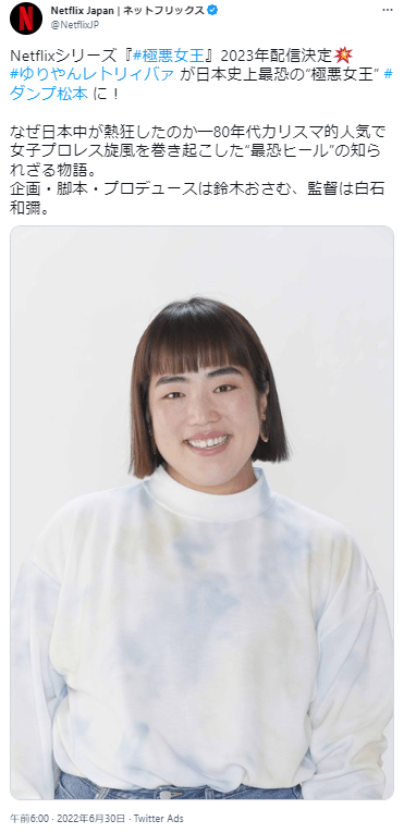 「先日『極悪女王』撮影中において、ゆりやんレトリィバァさんが演技中に背中及び頭を打ったことを受け医師の診断を受けたところ、大事をみて2週間の安静の指示を受けられました。それに伴い、『極悪女王』の撮影は一部延期いたします。