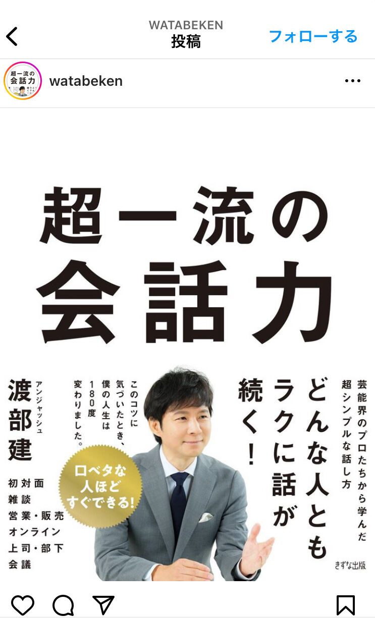 アンジャッシュ渡部建(50)が2日、インスタグラムを更新。20日にビジネス書「超一流の会話力」(きずな出版)を出版すると発表した。