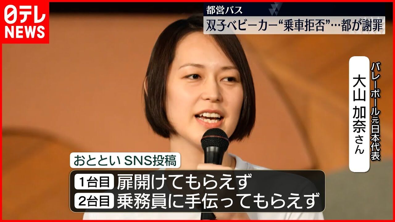 バレーボール元日本代表の大山加奈さんが、双子用ベビーカーと都営バスに乗ろうとして乗車拒否されたなどと明らかにしたことに対し、8日夜、東京都は、一部の対応が不十分だったと謝罪しました。
