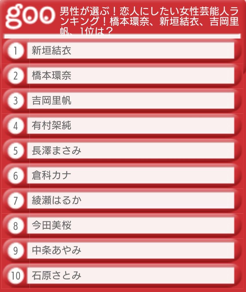 男性が選ぶ!恋人にしたい女性芸能人ランキング