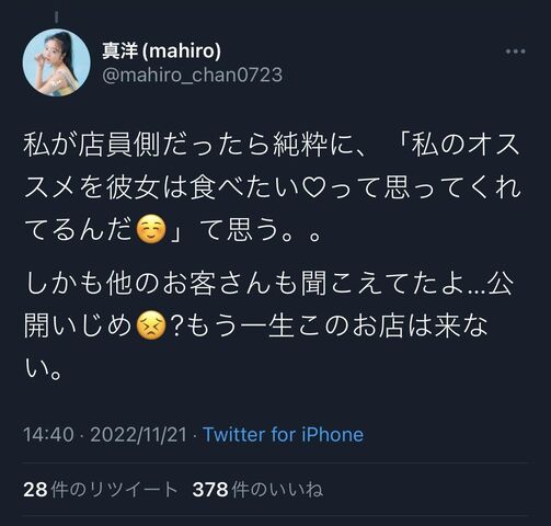 しかも他のお客さんも聞こえてたよ…公開いじめ😣?もう一生このお店は来ない。