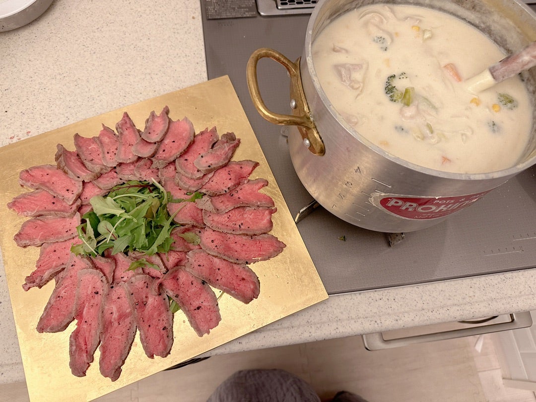 続けて「後はシチューやローストビーフやサラダやラザニア作ってます」と報告。「後はお寿司 頼んだ」とつづった。