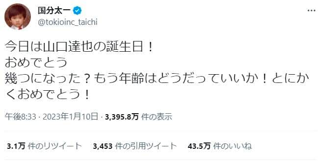 かつてのメンバーを祝う国分さんのツイートには、40万件を超えるいいねが集まるなど大きな反響が。リプライ欄には、「本当に嬉しいです」「太一くんはお祝いしてくれると思ってたよ」「さすが太一くん忘れずにおめでとうしてステキ」といった好意的な声が寄せられた。
