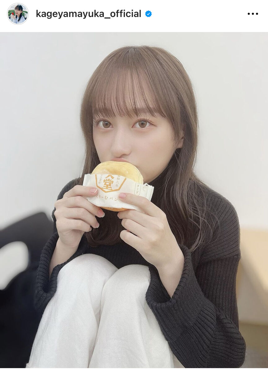 目を閉じて堪能するような表情も 影山は「収録前くりーむパン」と記し、楽屋でクリームパンを頬張る写真をアップ。
