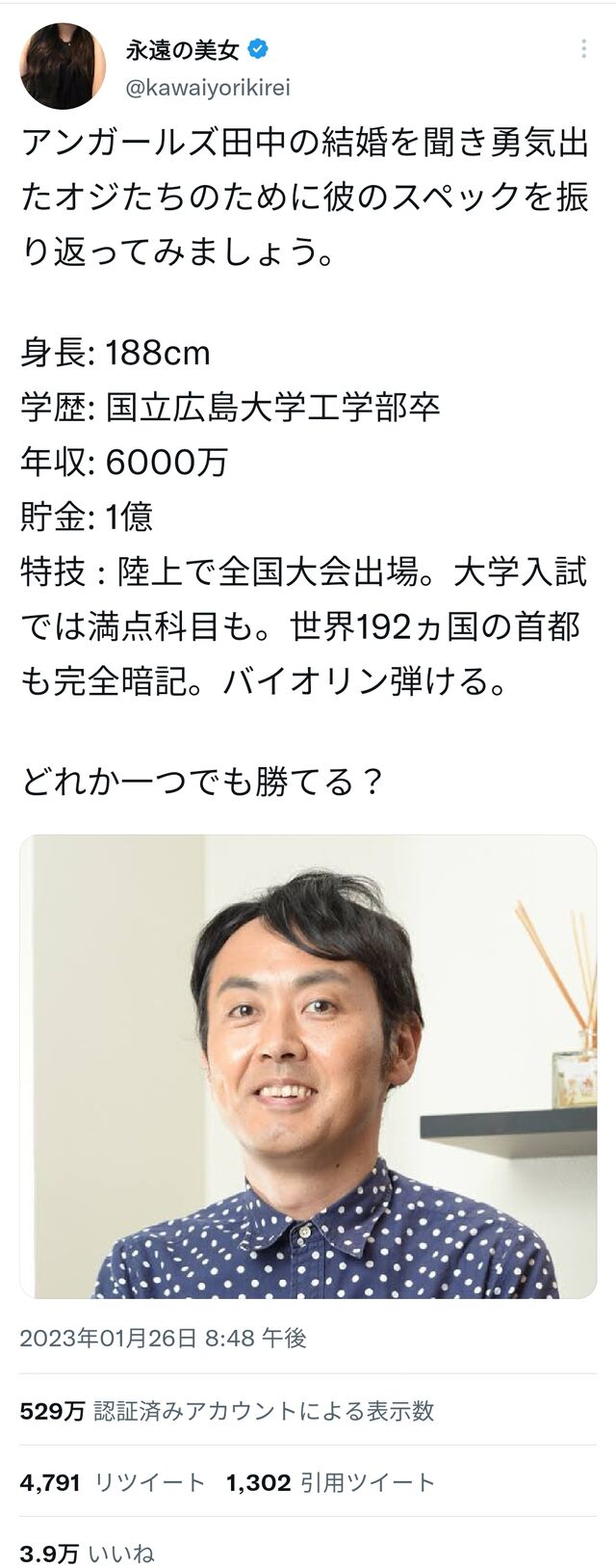 【悲報】女性「アンガ田中の結婚を聞き勇気出た弱者男性いるけど、お前ら何か1つでも勝てるとこある? 2023/1/31 芸能人の気になる噂 1: それでも動く名無し 2023/01/27(金) 13:02:16.47 ID:9taB2Arhd 続きを読む Source: 芸能人の気になる噂