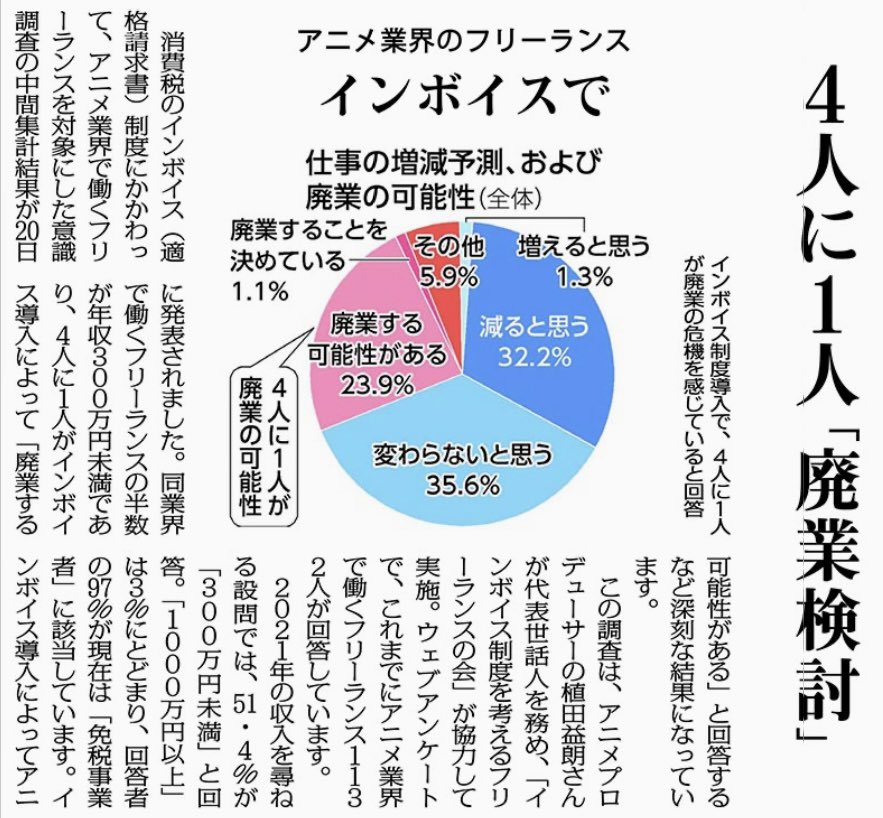 およそ4人に1人が廃業を検討──。驚愕の事実が明らかになった。昨年秋に声優やアニメ、漫画、演劇といったエンターテインメント業界4団体が、関係者たちにインボイスの影響について尋ねたアンケートの結果だ。