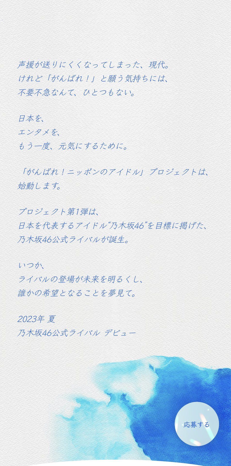 昨秋に設立した株式会社「Ligareaz Management(レガリアスマネジメント)」が、「がんばれ!ニッポンのアイドル」プロジェクトの第1弾として、「乃木坂46公式ライバルオーディション」を開催する。応募資格は12歳から22歳までの女性。募集期間は2月18日までで、その後全国規模の大型オーディションを数カ月間かけて実施し、4月22日に最終選考を予定。次世代を担うアイドルの原石を発掘し、エイベックス・エンタテインメントから今夏のメジャーデビューを目指すという。