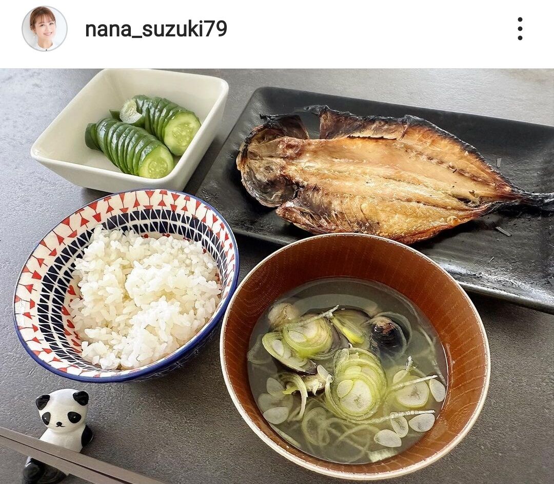 鈴木は「お昼ごはん あじの開きとしじみの味噌汁 きゅうりのぬか漬けでした あとマグロのお刺身も食べました!」「#おうちごはん」のハッシュタグをつけ、和食の手作り昼ご飯をアップ。