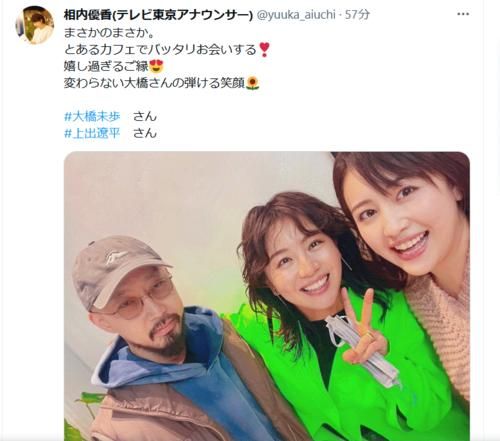 テレビ東京の相内優香アナウンサー(36)が9日までに自身のインスタグラムを更新。同局出身のフリーアナウンサー・大橋未歩(44)とテレビプロデューサー・上出遼平氏夫妻にばったり出くわしたことをつづった。