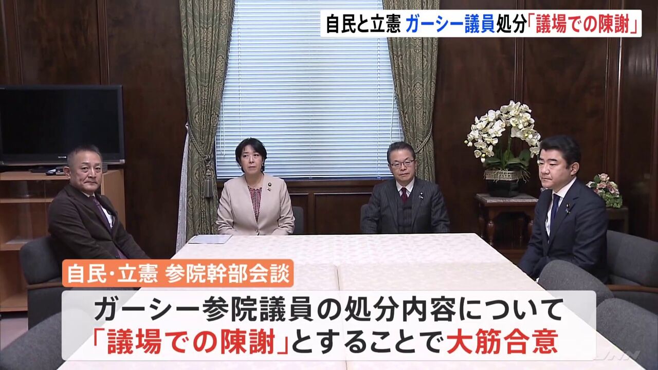 国会では先ほど、自民党と立憲民主党の参院幹部が会談し、ガーシー議員に対する処分内容について「議場での陳謝」とすることで大筋合意しました。4段階ある処分のうち、「除名」「登院停止」に次ぐ3番目の重さの処分です。