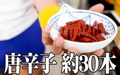 魚肉ソーセージの両面に焼き目がついたら、タマネギと唐辛子を加えます。「唐辛子約30本」と取り出した池崎さんに、スタッフから「え!?」と驚きの声が。ところが、料理を進めてもあまり辛そうな香りがしてきません。池崎さんは「炒め方が弱いのかな」と少し心配そう。