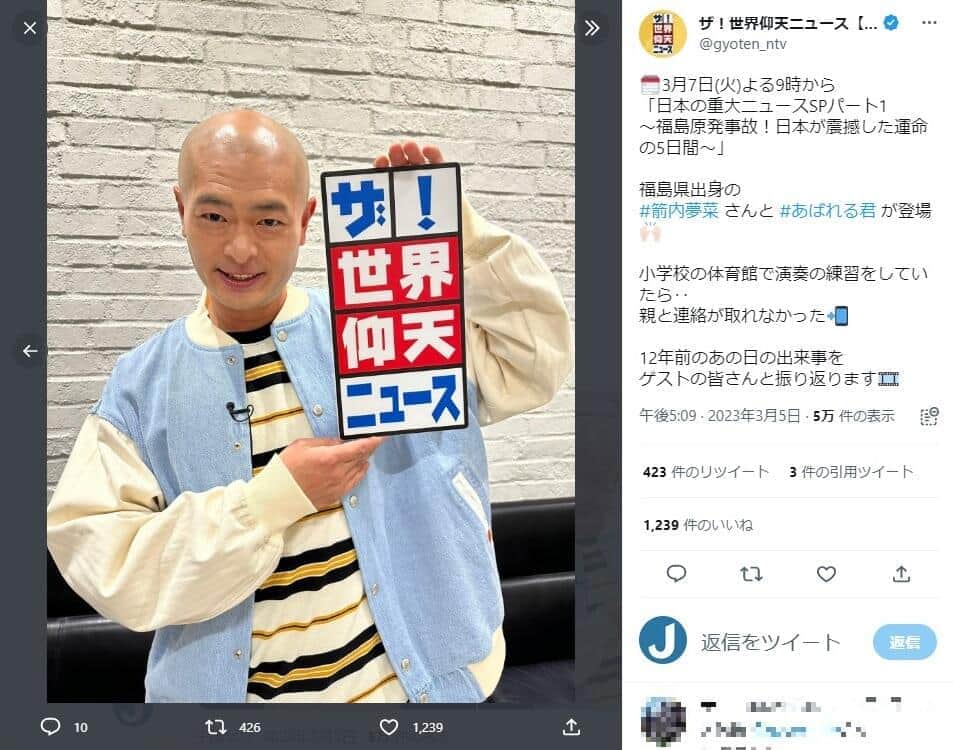 2023年3月7日に放送された「ザ!世界仰天ニュース」(日本テレビ系)に出演したお笑い芸人のあばれる君(36)について、視聴者から「めっちゃ痩せた…何があった…?」といった声がツイッターに相次いで上がった。
