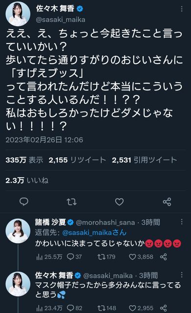 イコラブ・佐々木舞香「通りすがりのおじいさんに『すげえブッス』って…」 ファン「ありえない」と衝撃