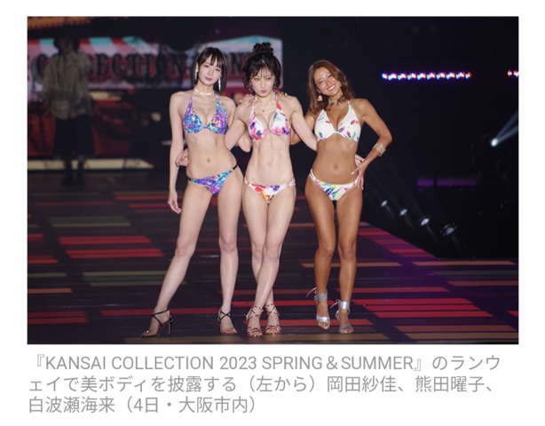 『KANSAI COLLECTION 2023 SPRING&SUMMER』のランウェイで美ボディを披露する(左から)岡田紗佳、熊田曜子、白波瀬海来(4日・大阪市内)