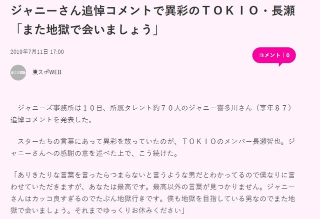 長瀬智也「ジャニーさん、あなたはたぶん地獄行きです」 2023/3/17 芸能人の気になる噂 1: それでも動く名無し 2023/03/10(金) 17:15:27.16 ID:Aqj4zRrzM ジャニーさん追悼コメントで異彩のTOKIO・長瀬「また地獄で会いましょう」 https://www.tokyo-sports.co.jp/articles/-/149298 続きを読む Source: 芸能人の気になる噂