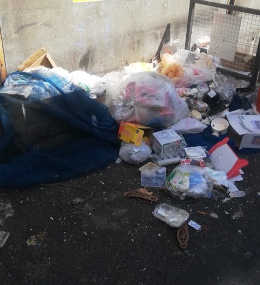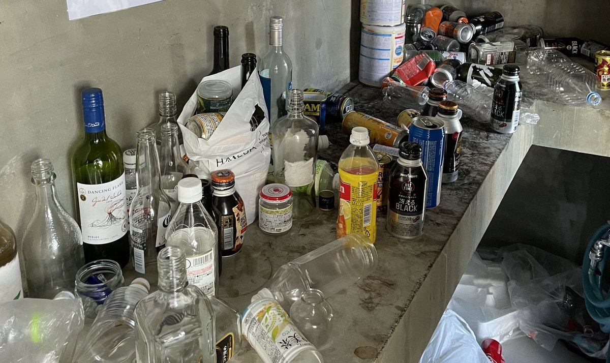 画像ではビン、カン、ペットボトルが分別されず置かれていたり、ダンボールはまとめられていなかったり、分別されていないゴミが回収カゴから溢れ出していたり、そもそも袋にすら入れられていないものも。