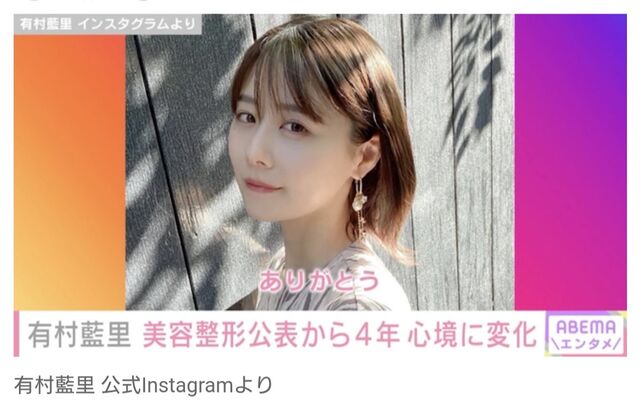 2019年に美容整形を受けたと明かしていたタレントでモデルの有村藍里(32)。公表からおよそ4年が経過し、“整形前の自分を愛おしく思えるようになった”と明かした。