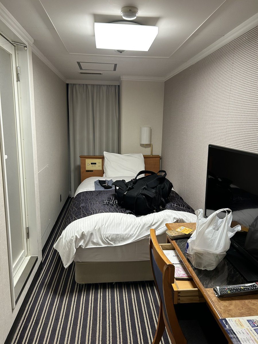 その後、到着したホテルの部屋を捉えた写真を投稿。部屋の横幅はベッドを置いたらギリギリ。その手前に机やテレビが置かれたワンルームのようだ。