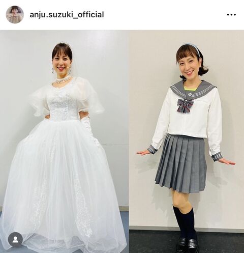 鈴木は「去年は『ウェディングドレス』今年は『セーラー服』」とウエディングドレス姿の写真も並べて公開した。そして「いくつになっても着させていただける機会に恵まれてワクワクして ドキドキして楽しくて 照れくさくてなんて幸せなことだろう」とつづった。