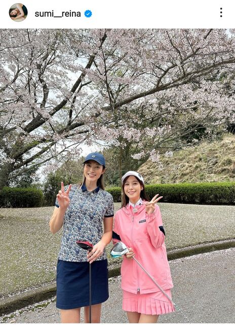 写真ではゴルフコースに咲く満開の桜の下で、狩野さんとのツーショットなどを公開した。