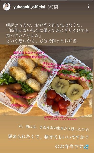 お笑いコンビ「ナインティナイン」矢部浩之の妻で、元TBSでフリーの青木裕子アナが30日にインスタグラムのストーリーズを更新し、手作り弁当を公開した。