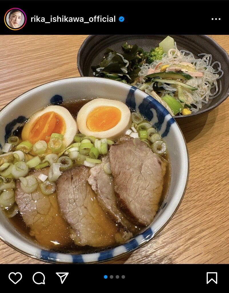 「昨日は撮影だったので、前日に作り置きしておいた物で夕飯にしました!」と書き出した石川。「電気圧力鍋で作ったチャーシューと煮卵を乗せてラーメン おかずはちょこっとずつ適当に」のコメントとともに大きなチャーシューと煮卵、ネギがたっぷり乗ったラーメンの写真をアップした。本格的な器と盛り付け、付け合わせのサラダも合わせて、まるでラーメン店のような本格的な仕上がりにはたくさんの「いいね!」が集まった。