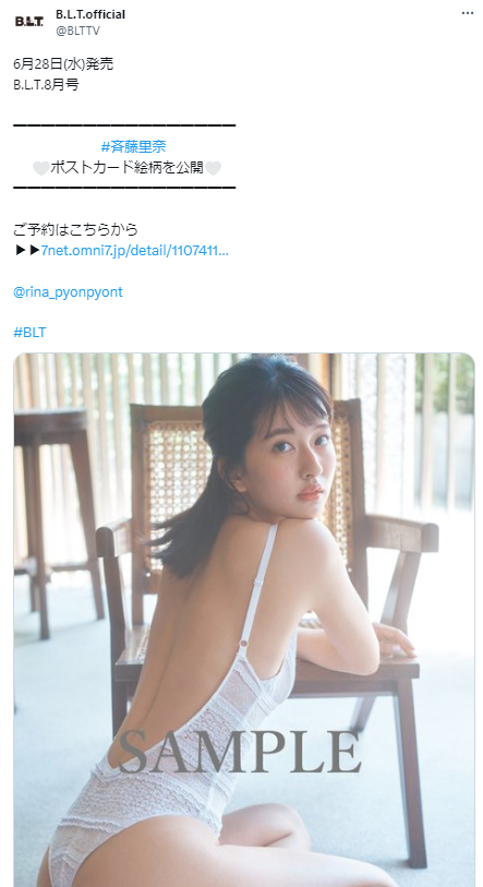 講談社主催のミスコン『ミスマガジン2022』で『ミス週刊少年マガジン』を受賞した斉藤里奈(22=中央大卒)が、2023年6月28日発売の雑誌『B.L.T.2023年8月号』で、お尻の大部分が見えているほぼTバックグラビアを披露することがわかりました。