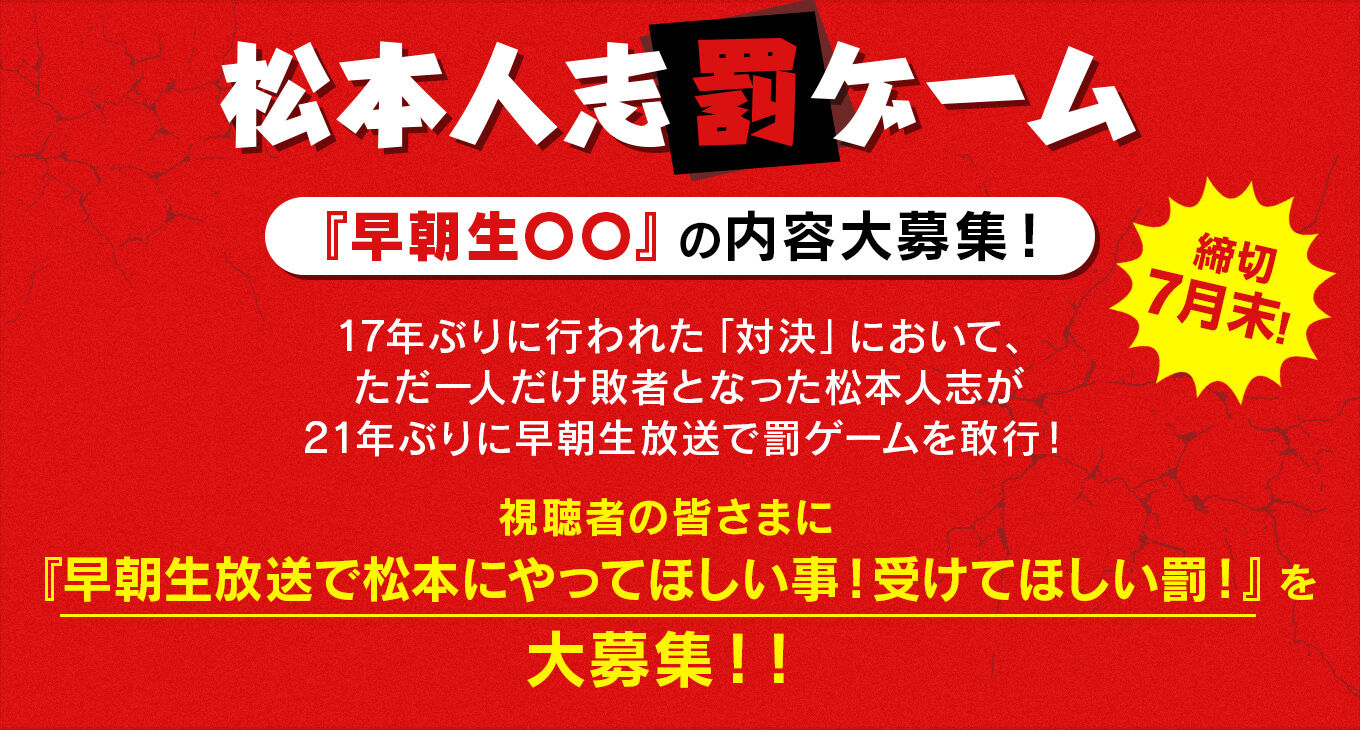 番組公式ツイッターでも「松本1人ぼっちの罰ゲームは… 約21年ぶりの早朝生放送罰ゲームに決定 松本にやってほしいこと&こんな姿が見てみたい!!など早朝罰ゲーム案をHPで大募集 皆さんのアイデアで松本に罰を食らわそう」と妙案を求めた。