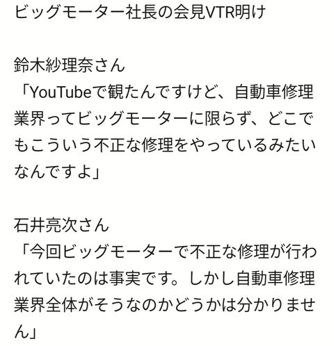 鈴木紗理奈、ビッグモーター謝罪会見の話題で「youtubeで他社も不正修理やってるって告発動画見た」とぶっこむ 2023/7/27 芸能人の気になる噂 1: 以下、5ちゃんねるからVIPがお送りします 2023/07/25(火) 19:55:50.256 ID:sbB1kV3J0 なおMCの石井アナはビッグモーターの件は事実だが他社がどうかはわからんとフォロー ソース https://livedoor.blogimg.jp/uwasainfo/imgs/7/b/7bb0c6ed.jpg 続きを読む Source: 芸能人の気になる噂