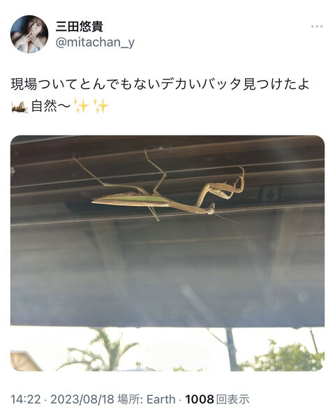グラビアアイドル「とんでもなくデカいバッタ見つけた!」 2023/8/22 芸能人の気になる噂 1: それでも動く名無し 2023/08/18(金) 14:33:47.49 ID:8j908k5Qa これはでかい 続きを読む Source: 芸能人の気になる噂