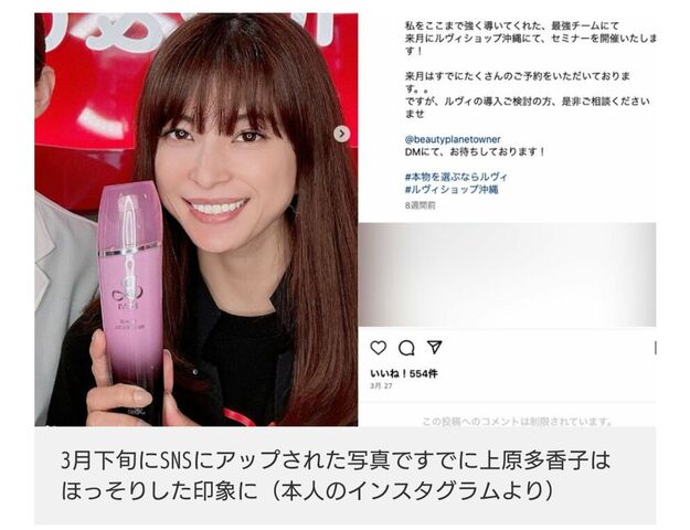 ちょうどこの前、8月11日には沖縄テレビの『KUKURU』(フジテレビ系)でも店舗が紹介されたんです。リポーターが実際に施術を体験する一幕もありました。ブランドの顔として押し出し続けた上原さんのスキャンダルで背負ったマイナスイメージを、少しでも払拭しようとしているのではないでしょうか」(沖縄県在住ライター)