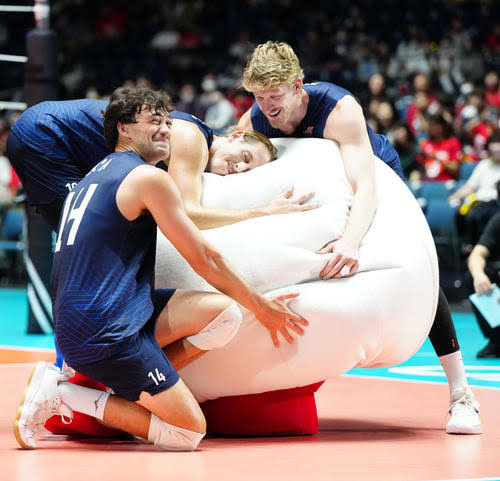 全セットで10点以上の差をつける完勝だったが、試合後も、その「強さ」を見せつけた。喜びのあまり、米国代表のテーラー・アベリルはマスコットキャラクターのバボちゃんを上から体重を押しつけるように抱きしめた。