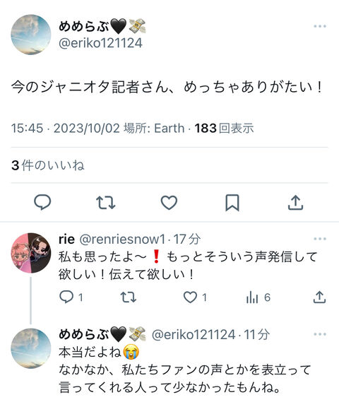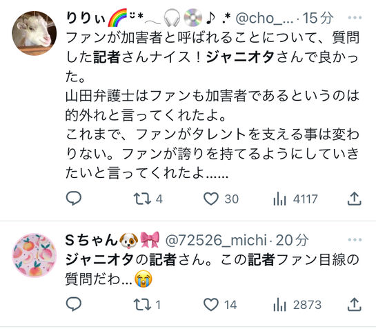 【速報】ジャニーズ会見に現れたジャニオタ記者さん、大絶賛される 2023/10/6 芸能人の気になる噂 1: それでも動く名無し 2023/10/02(月) 21:57:53.79 ジャニオタ記者「私は昔からジャニーズが大好きでファンです。今回の問題んでファンも加害者だと言われるのはおかしい!」 続きを読む Source: 芸能人の気になる噂