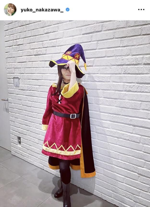 「時差投稿。少し前に。コスプレしました。手が震えるくらい緊張しました」と書き始め、暁なつめさんの小説「この素晴らしい世界に祝福を!」に登場するキャラクター・めぐみんにふんした姿を披露した。