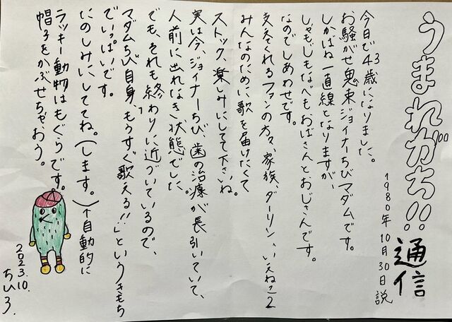 自身の公式サイトに「うまれがち!!通信」と題した直筆の書面をアップした鬼束。《今日で43歳になりました。お騒がせ鬼束ジョイナーちびマダムです》と切り出し、《支えてくれるファンの方々、家族、ダーリン、いえねこ2 みんなのために歌を届けたくて ストック、楽しみにしててくださいね》(原文ママ)と綴った。そのいっぽう、こう明かした。