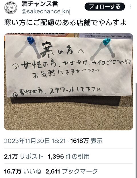 居酒屋「寒かったら女性にはひざかけ提供します男はスクワットしてろ」これが炎上する理由 2023/12/6 芸能人の気になる噂 1: それでも動く名無し 2023/12/02(土) 07:32:51.08 ID:D+NoGjGEr どう見ても冗談やろ 続きを読む Source: 芸能人の気になる噂