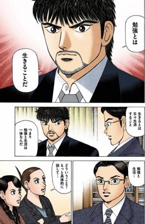 東大受験の立役者である桜木から「勉強とは何か」を問われた高原は、「然るべき教育環境の中で教養を学び、物事を考える力を養うこと」と答えます。しかし、これを桜木は一蹴。「勉強とは生きることだ。勉強と生活は一体なのだ」と返します。