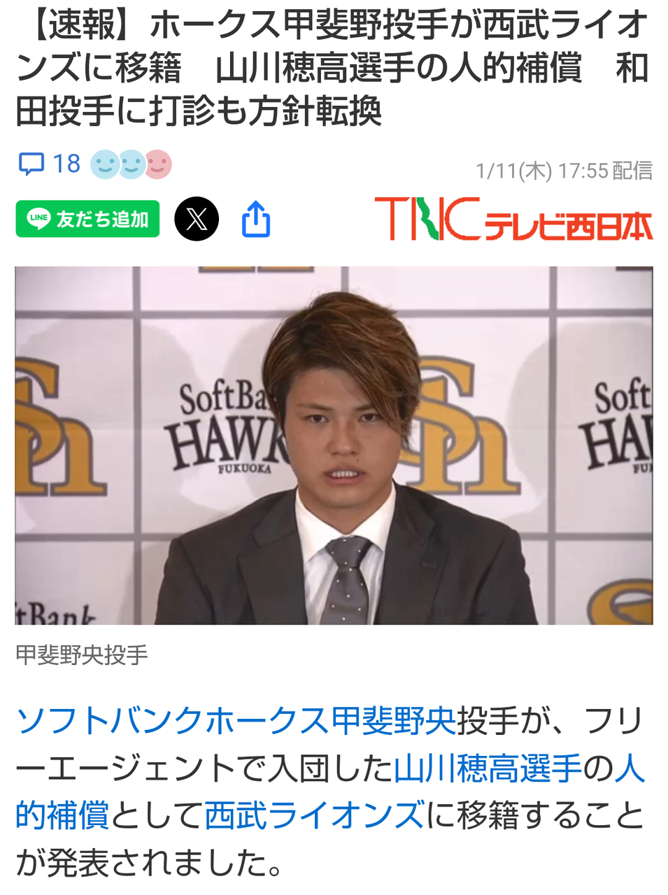 甲斐野投手の移籍は意外で驚きました。西武とのトレードで、山川選手が人的補償とのことですが、どのような影響があるのか気になりますね。今後のホークスの投手陣はどうなるのでしょうか。