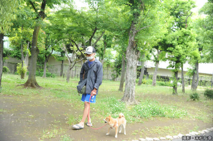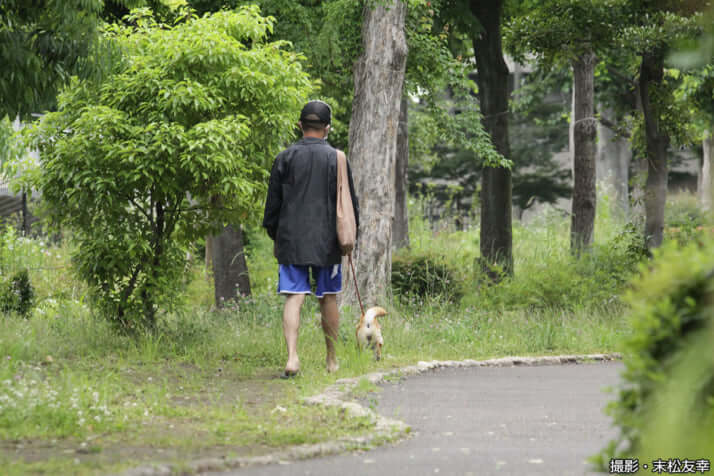 その判決から半年、事件発生から1年がたった5月19日の午後4時過ぎ、猿之助は自宅近くの公園にいた。半ズボンにサンダル履き、Tシャツの上にざっくりと羽織った上着が体形を隠すが、引きこもりがちの日々のせいか、かなり痩せたようで、足もすっかり細くなっている。その足元に小さな柴犬が、ちょこちょことまとわりついていた。