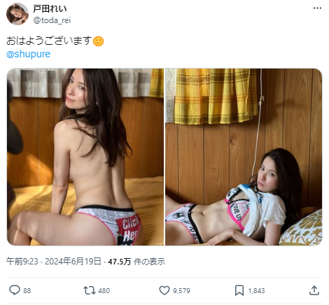 年齢を重ねるごとに魅力を増すグラビアレジェンド・戸田れい(37)が、2024年6月19日、自身のX(旧Twitter)を更新。発売中の雑誌「週刊プレイボーイ」で披露しているグラビアのオフショットを公開すると、水着のブラを外して横乳を大胆に見せた姿に約1万件の「いいね!」が寄せられていました。