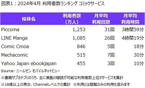 3位はNTT傘下の電子コミックサービス「コミックシーモア」(846万人)で、以下「めちゃコミック」(515万人)、「ebookjapan」(455万人)と続いた。