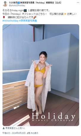 発売に先駆け、写真集の公式X(旧Twitter)では、黄色のビキニ姿で豊満なバストを露出したオフショットが公開され、ファンから興奮の声が殺到していました。