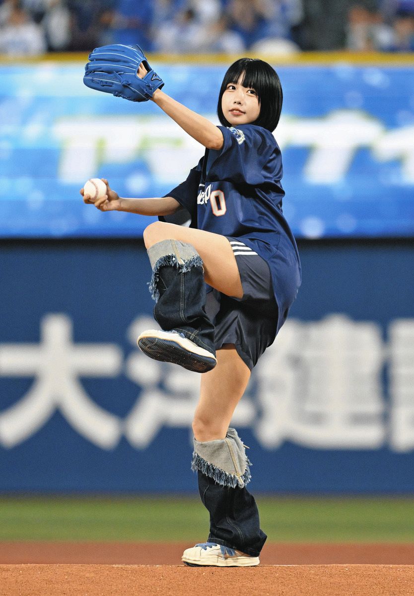 碧グローブと青のショートパンツに、「ANO」と書かれた背番号0のユニホーム姿で登場。見事ノーバウンド投球を見せた。