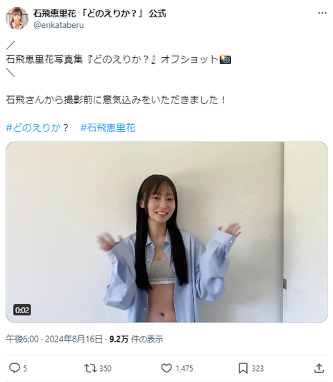 アニメ「魔法科高校の優等生」の水尾佐保役などで知られる美人声優の石飛恵里花(27)が、2024年8月16日、自身のX(旧Twitter)を更新。2024年秋頃発売予定の写真集『どのえりか?』のオフショットを公開したところ、カルバン・クラインの下着姿で撮影の意気込みを語る姿に、ファンから歓喜の声が殺到していました。