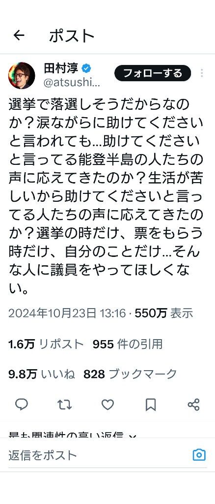 選挙で落選しそうだからなのか?涙ながらに助けてくださいと言われても…助けてくださいと言ってる能登半島の人たちの声に応えてきたのか?生活が苦しいから助けてくださいと言ってる人たちの声に応えてきたのか?選挙の時だけ、票をもらう時だけ、自分のことだけ…そんな人に議員をやってほしくない。