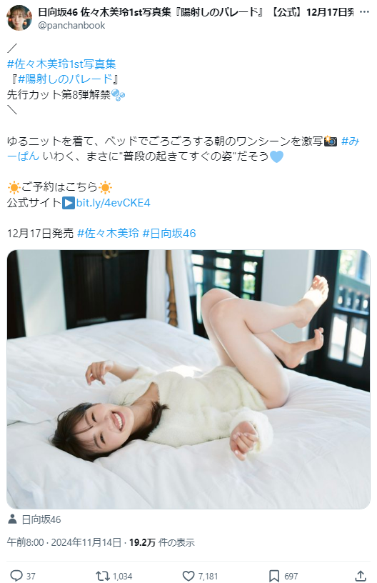 “みーぱん”こと日向坂46の人気メンバー・佐々木美玲(みれい=24)が、2024年12月17日、水着やランジェリーに初挑戦したファースト写真集『陽射しのパレード』を集英社から発売します。