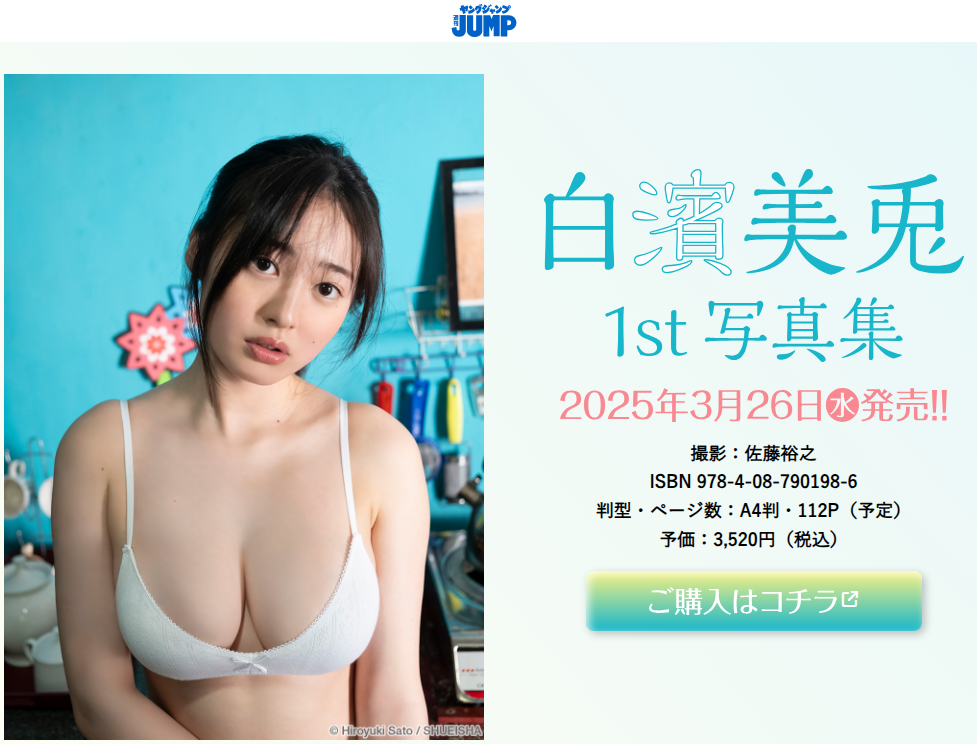 次世代美少女を発掘するオーディション『美少女図鑑AWARD2023』で3冠を受賞した、“鳥取が生んだ奇跡の美少女”こと白濱美兎(しらはま みう=18歳)が、2025年3月26日、1st写真集を発売することがわかりました。